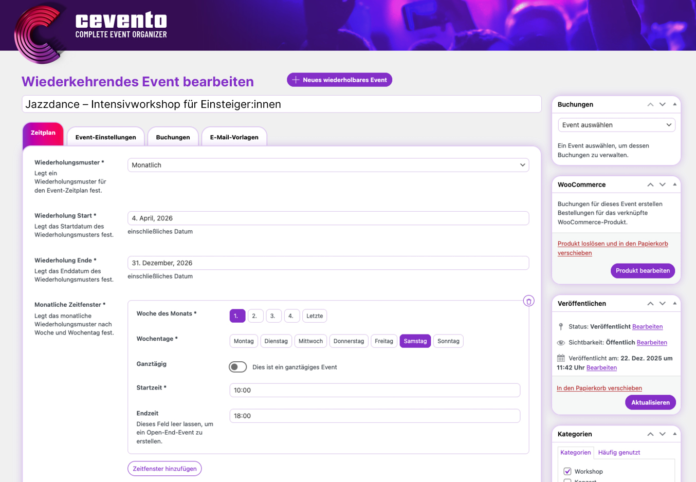 Cevento zeichnet sich durch ein besonders übersichtliches, benutzerfreundliches Backend aus. Der klar strukturiere Aufbau ermöglicht es auch Anwender:innen ohne Programmierkenntnisse, das Plugin zu konfigurieren. Außerdem punktet es durch sauberen Code und erweiterbare Hooks – perfekt für tiefergehende individuelle Anpassungen.